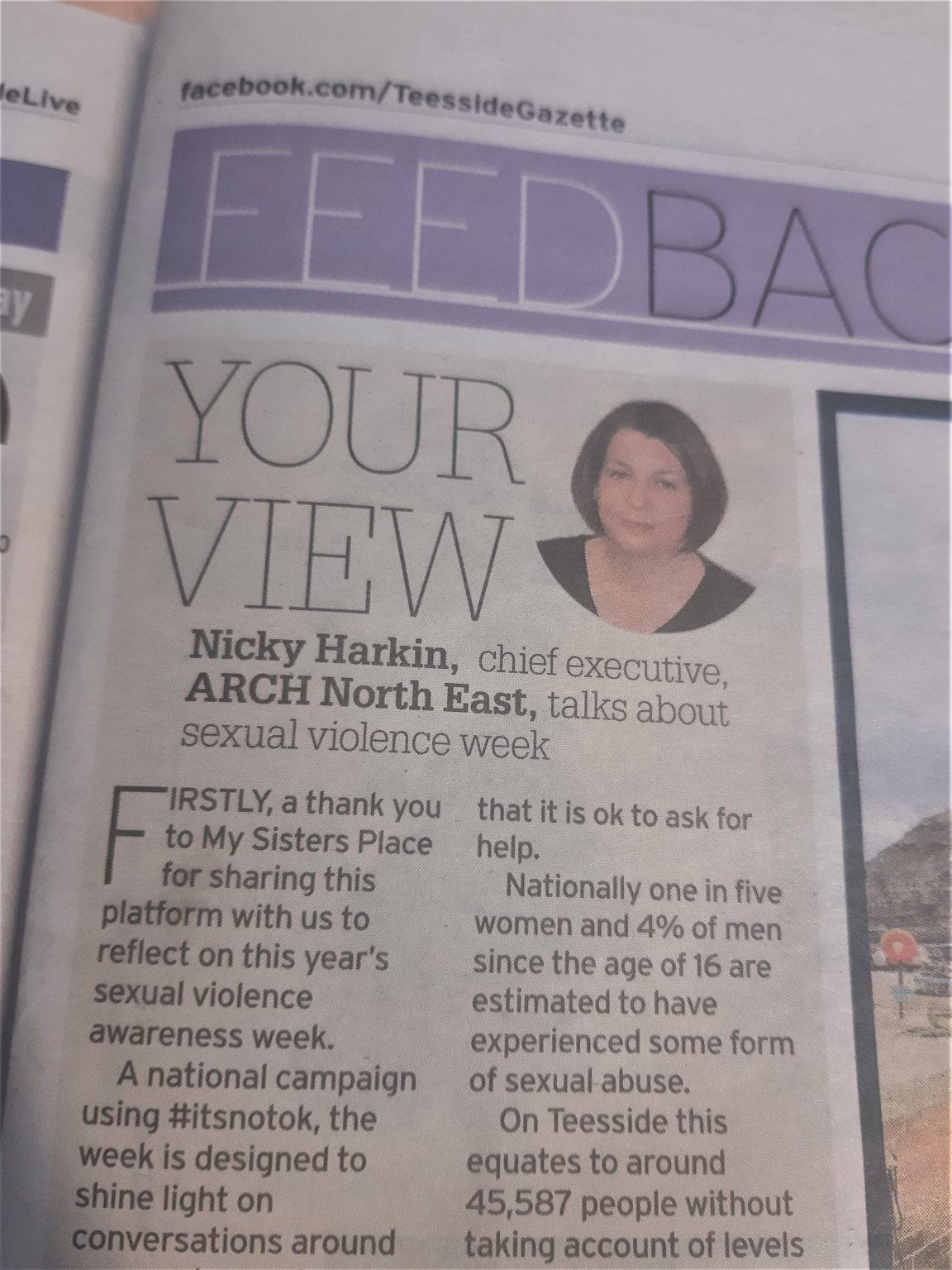 Nicky Harkin, Chief Executive of ARCH North East talks about Sexual Violence Awareness Week in this week’s Teesside Gazette. Guest column in partnership with My Sisters Place.